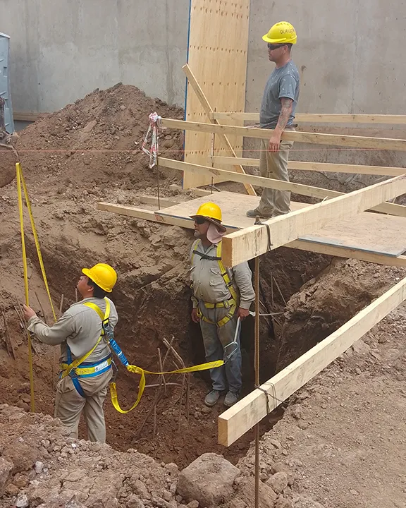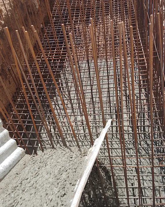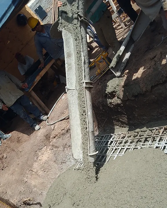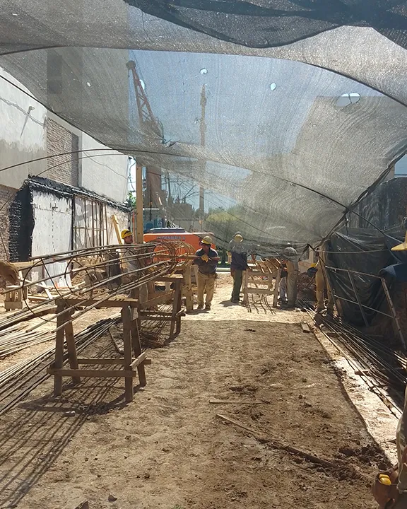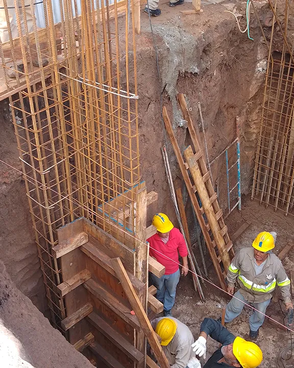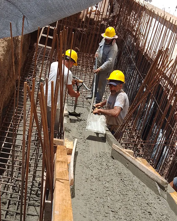 TRABAJO Estructura de hormigón armado y Albañilería. Ejecución de pilotes, vigas, losas, columnas, cabezales. Albañilería completa, divisiones interiores y exteriores. Construcción de Set, revoques, colocación de pisos, yesería y pintura.